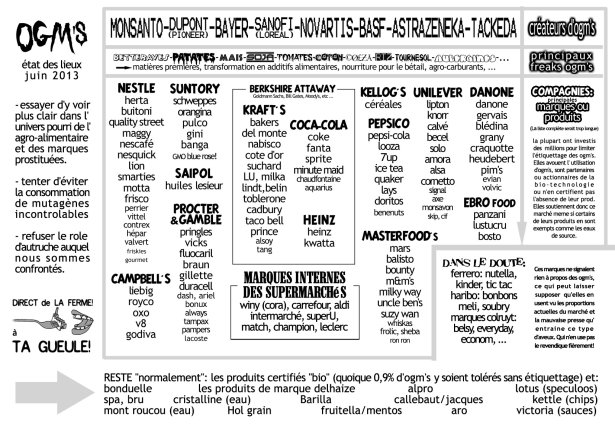 Le constat le plus amère face à l’enquête sur le sujet est de constater que c’est encore bien pire que ce qu’on pensait, que l’ensemble est contaminé à part quelques rares exceptions. Les marques qui semblent présenter une concurrence sont autant partenaires, les "companies" changent de mains à tour de bras. En gros, +/- douze majors tiennent le marché et sont pro-ogm’s, ils déclinent toutes les marques supposées nous rappeler notre enfance, s’en est à gerber !