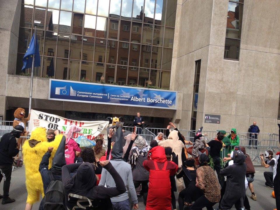 A Bruxelles, ce lundi matin, débutait le 14ème round de négociations sur le TTIP (Transatlantic Trade and Investment Partnership). Cette nouvelle semaine de négociations a été marquée par l’irruption de plusieurs dizaines d’animaux dans le périmètre de sécurité du Centre Albert Borschette où les négociateurs se trouvaient. Tout avait été fait pour tenir ce lieu secret. Même les invités à la journée des parties prenantes devant se tenir mercredi ne devaient être prévenus qu’à la dernière minute.