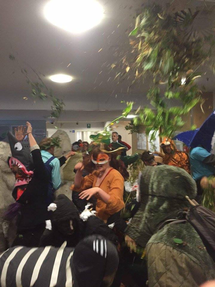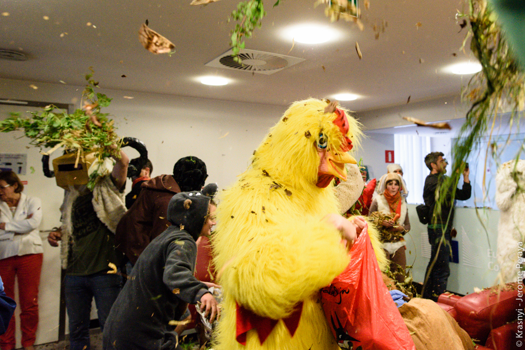 Les activistes de L’EZLN, dont la particularité est d’être déguisés en animaux, ont pu débusquer les négociateurs grâce à leur flair. Dans un premier temps, ils ont pénétré un des bâtiments de la DG Commerce de la Commission européenne pour y mener un happening dont la symbolique reste identique à leurs actions précédentes (pour voir leurs actions menées dans le cadre de la COP212 : incarner la "nature qui se défend" contre les gouvernements et multinationales qui menacent l’environnement, les droits de l’homme et la démocratie. Environ 70 animaux en tout genre, armés de légumes, dansant au rythme d’une musique classique (Le carnaval des animaux), ont laissé derrière eux un tapis de feuilles, de fleurs et de branchages.