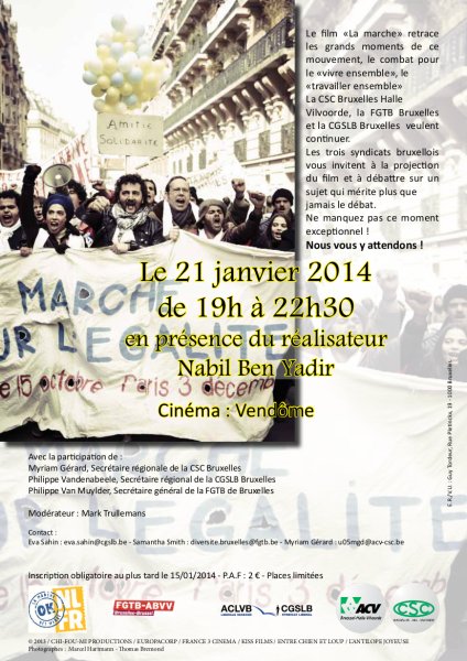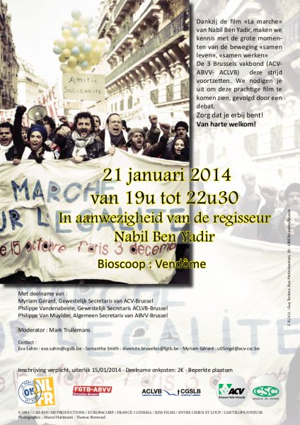 De drie vakbonden Brussel nodigen op een filmvoorstelling van “la marche”. Een film die het debat op gang brengt over een thema dat meer dan ooit brandend actueel is. Mis deze unieke gelegenheid niet, wij verwachten u !