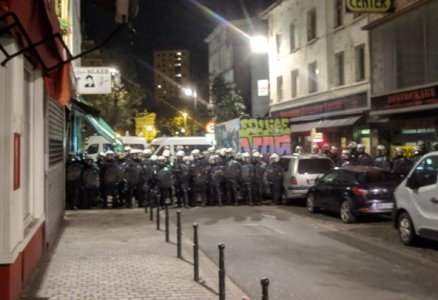 18.40 : La manifestation annoncée à 17h à finalement quitté la Place du Jeu de Balle vers 18h. À peine engagée dans la Rue Blaes, des cordons de police anti-émeute ont encerclé la manifestation. À 18h40, les manifestants sont toujours passés, la Samba continue à jouer.