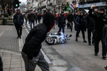 Sur son parcours, la manifestation a d’ailleurs parfois des allures de vente à la criée. A la sortie du boulevard de Berlaimont, des membres du PTB tentent de rallier la foule en promettant une augmentation des pensions à 1.500 euros net. Quelques mètres plus loin, le bus de la FTGB à l’apparence d’un School Bus américain mais socialiste (car peint en rouge), fait grand effet auprès du public. A l’approche du siège du PS, sur le boulevard de l’Empereur, un petit groupe de manifestant.es semble ne pas avoir été dupé par la mascarade du jour. En visant la façade, ils scandent : « P comme pourris, S comme Salauds, à bas le Parti Socialo ! », ou encore : « Ni Dieu, ni maître, ni social traîtres ! ».